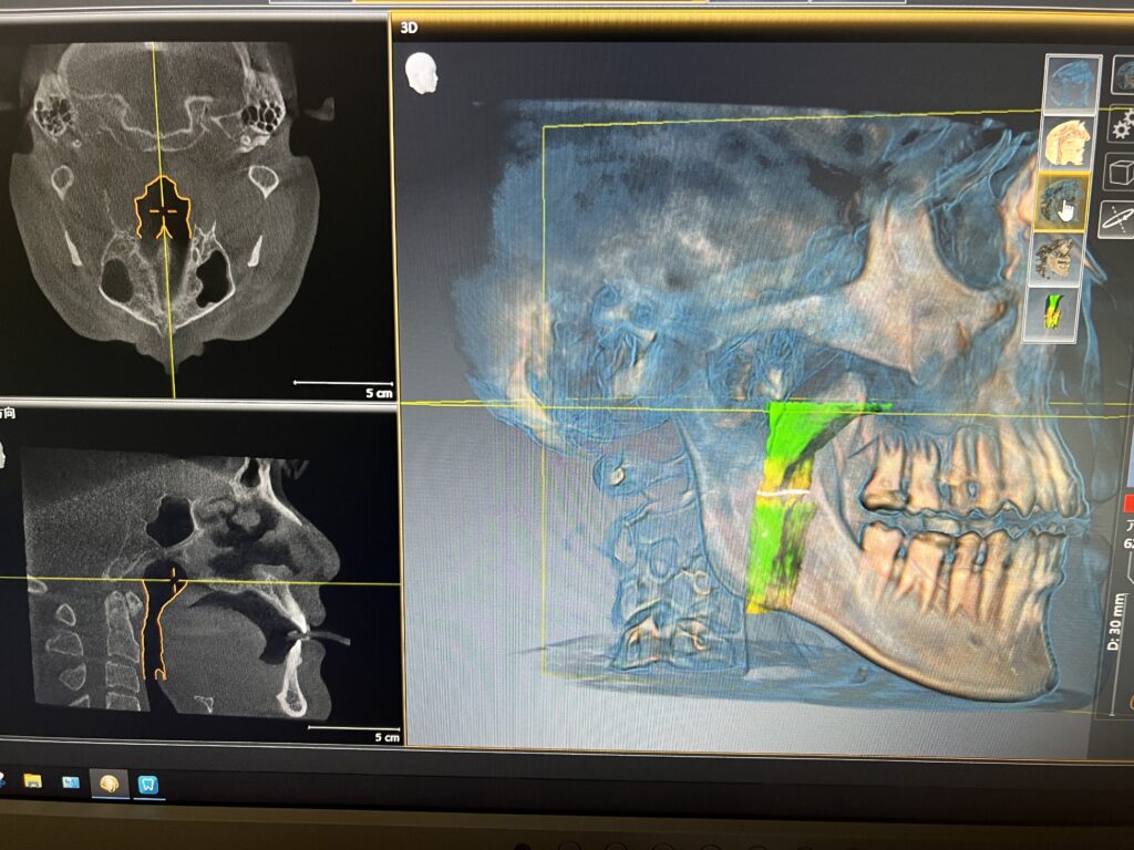 こちらは3次元的に骨や歯を見ることが可能で、2Dの2次元的な撮影ではわからない親知らずなどの埋伏している歯の位置、骨の厚みや幅、骨の内部の神経や血管が入っている空間の位置、腫瘍などが疑われる場合の位置や骨の中なのか外に出てきているものか、などなど詳しい情報を沢山見ることができます。