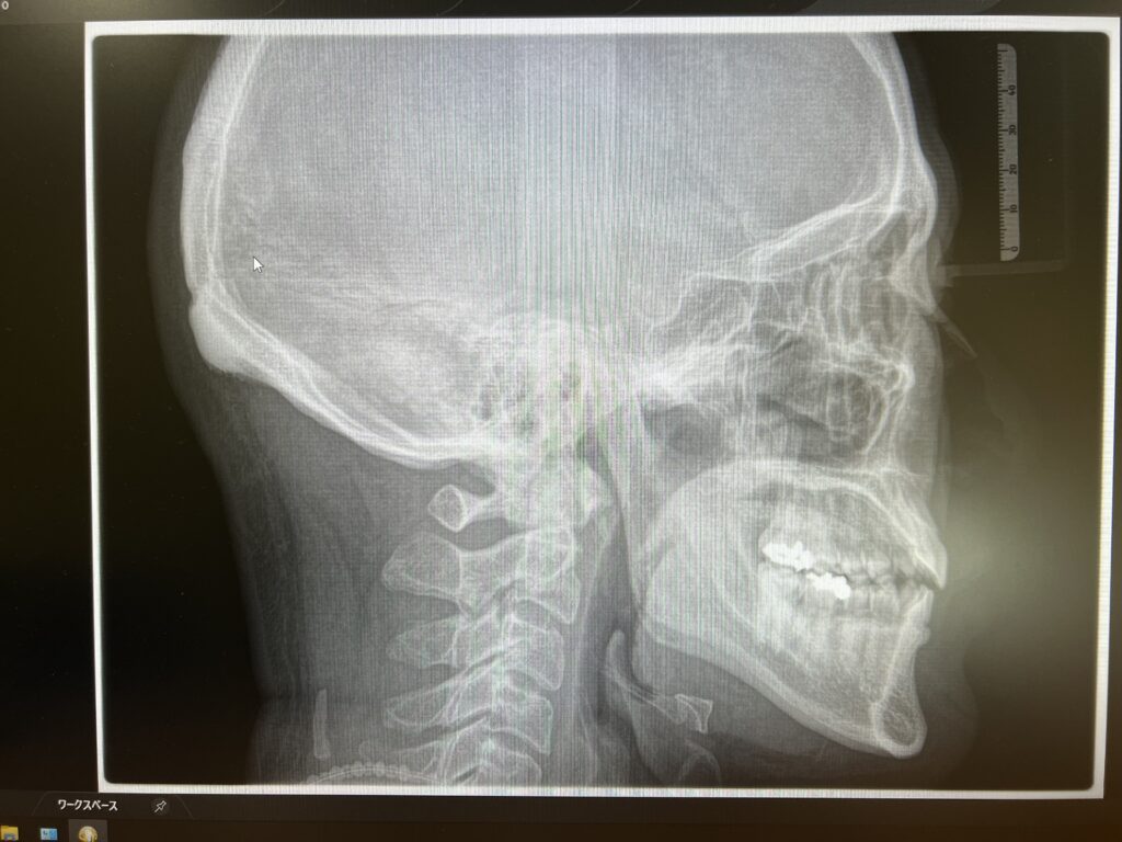 セファロ:主に矯正治療(←押して頂くと矯正ページへ)の際に使う規格化されたレントゲン撮影で、一定の距離と顔の傾きなどを出来るだけ合わせて撮影し、歯の傾きや骨格的な問題などの診断、矯正前後の比較をするためのレントゲン