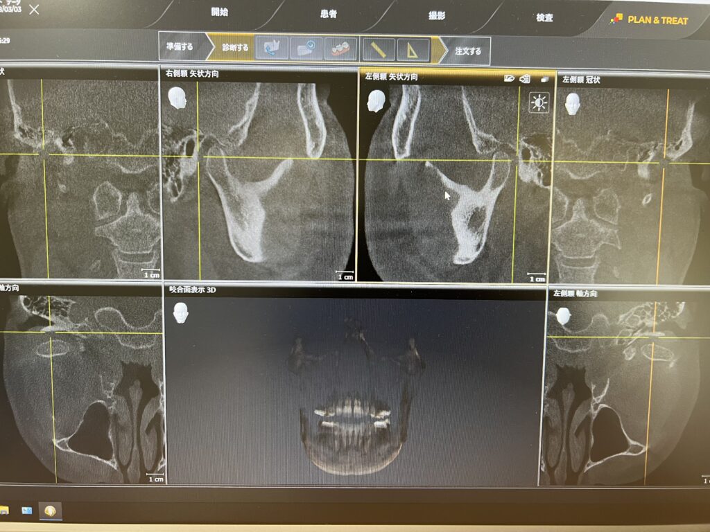 ・口腔内のオペ後で、術後の経過で通常のレントゲンでは術後の経過がわからない場合はCT撮影での経過観察を行うことがあります。