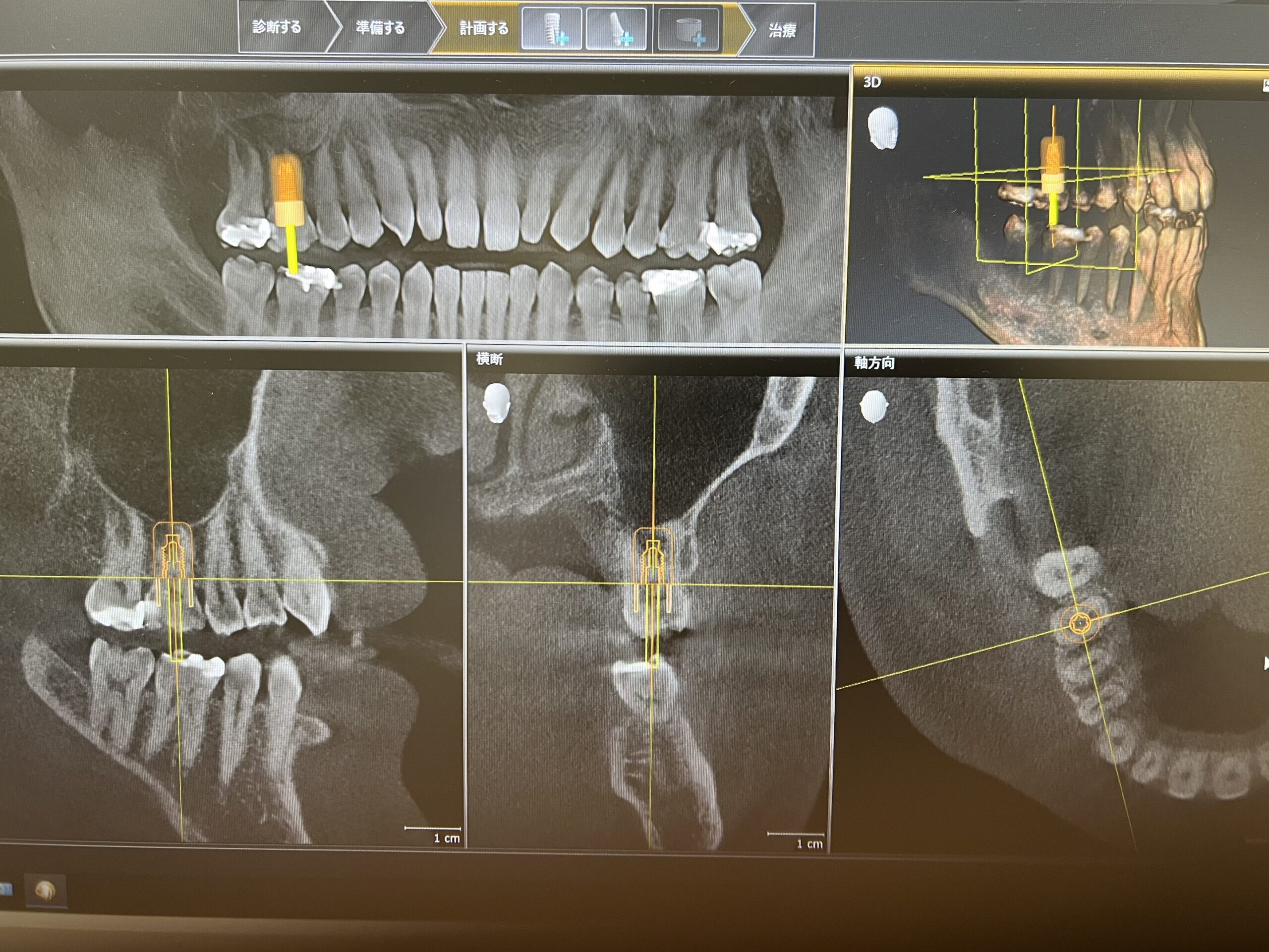 CTで骨の状態を確認し、各インプラントメーカーのインプラントの長さや太さなどの形状を当てはめてシミュレーションするソフトが内蔵されております。