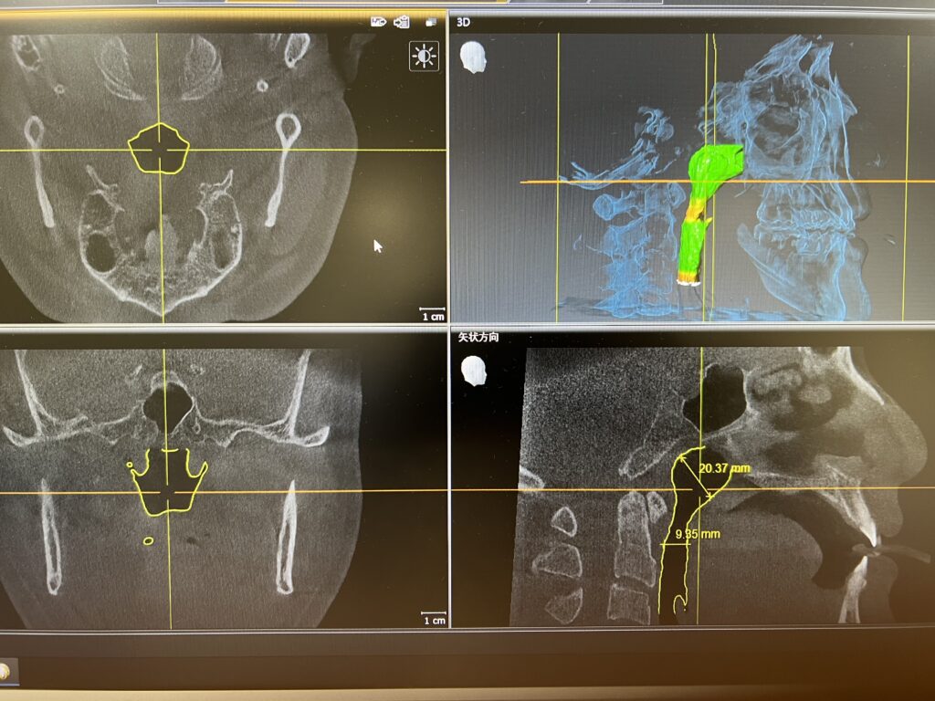 気道解析ソフトについて:突然死のリスクや急な眠気による事故など、睡眠時無呼吸症候群で起こる様々な問題も気道と関係していたりするので、気道の広さを確認できるソフトとそれを改善させる可能性がある矯正治療や噛み合わせ治療、また睡眠時無呼吸の際に歯科で行う口腔内装置の作成前後の変化の確認にも使えます